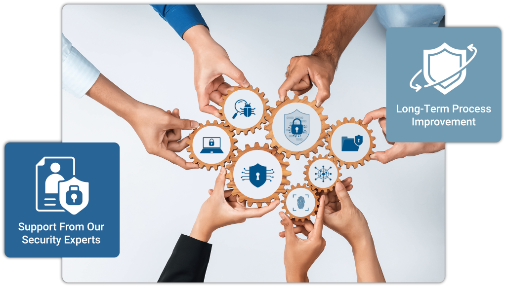We help your team mobilize efficiently through our platform, which enables easy remediation management through role-based task distribution and a Kanban board interface. Furthermore, with regular cadence meetings our security experts provide remediation guidance and help your team improve your processes, supporting long term improvement.