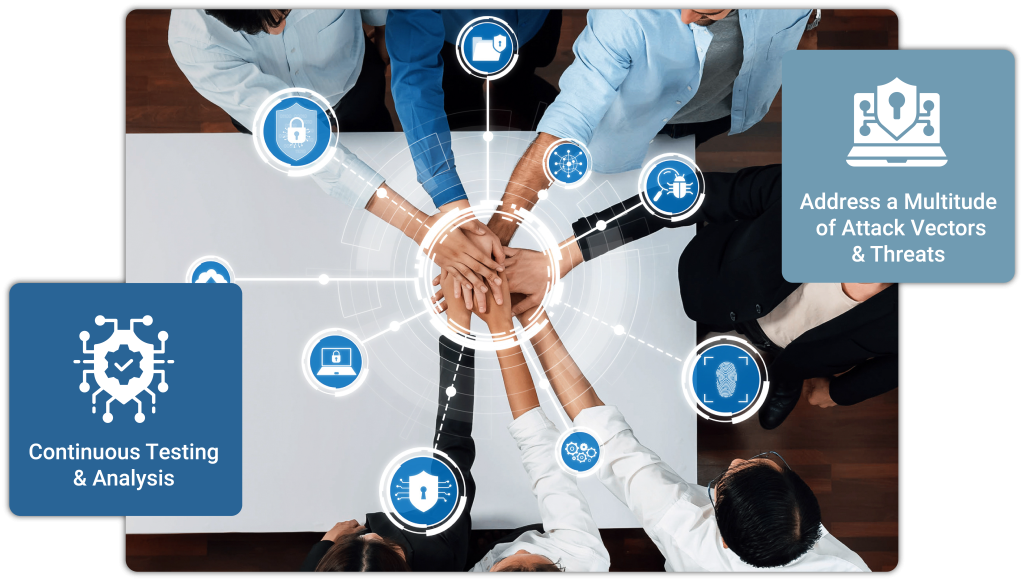We support regular validation through continuous testing and analysis of your security posture, constantly identifying exploitable vulnerabilities, actionable credentials, risky vendors, insecure source code, and much more.