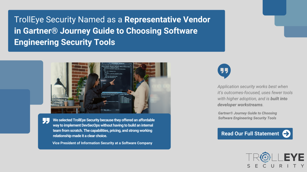 February 26th, 2026 – TrollEye Security today announced it has been identified in the Journey Guide to Choosing Software Engineering Security Tools by Gartner as a Representative Vendor in the Penetration Testing as a Service (PTaaS) category supporting the pre-production phase of the software development lifecycle.